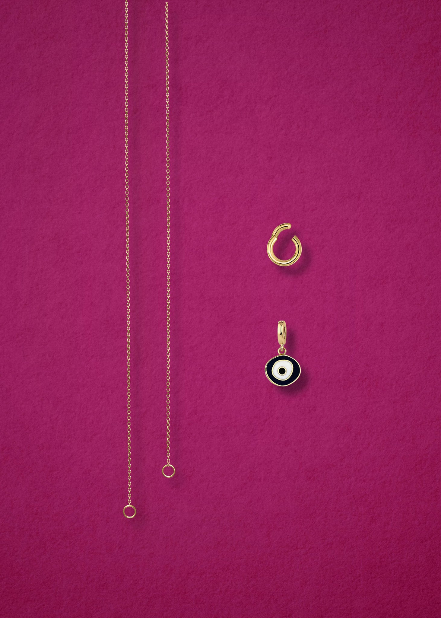 The Golden Grace Obsidian Organic Evil Eye Necklace is a bold statement of strength and modern elegance. This curated set includes three beautifully crafted pieces: the Golden Grace Cable Chain, made in 14K solid gold; the sleek Golden Link Charm Holder for effortless styling; and the Obsidian Organic Evil Eye Charm, designed in 14K solid gold with hand-painted black and white enamel, symbolizing protection, strength, and inner balance.