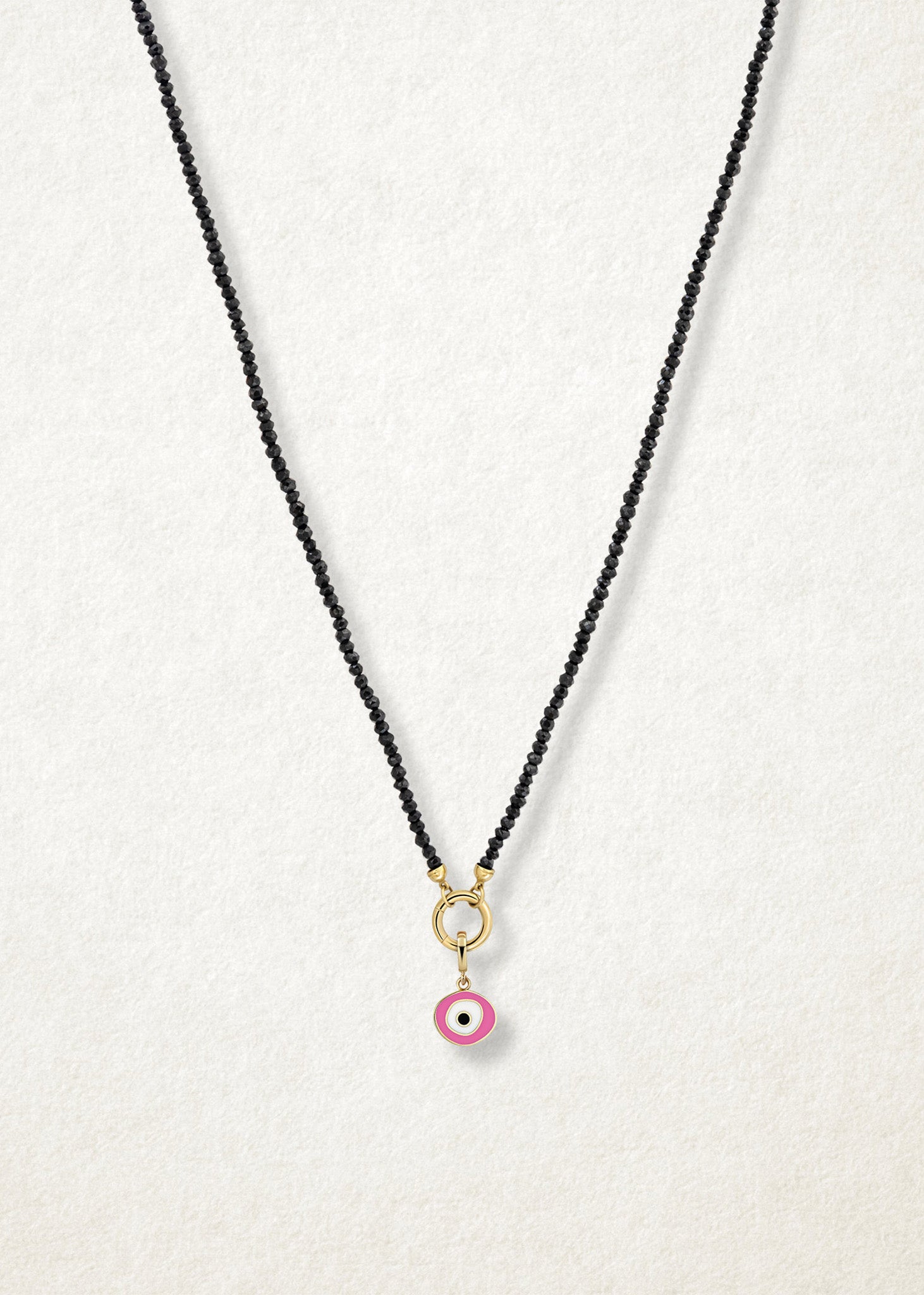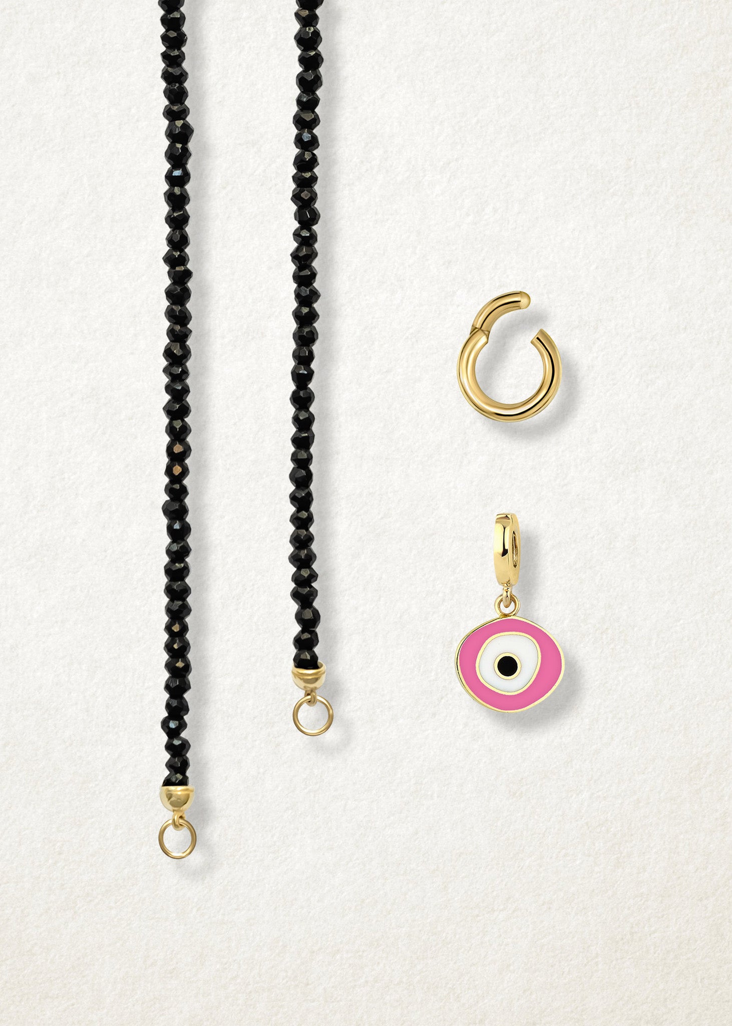 The Noir Elegance Blush Organic Evil Eye Necklace is a romantic fusion of protection and feminine sophistication. This curated set includes three beautifully crafted pieces: the Noir Elegance Charm Necklace, featuring faceted black spinel beads and a 14K solid gold clasp; the sleek Golden Link Charm Holder for seamless styling; and the Blush Organic Evil Eye Charm, crafted in 14K solid gold with hand-painted blush pink and black enamel. Its organic, freeform design adds an artistic softness, symbolizing intuition, grace, and protective energy.